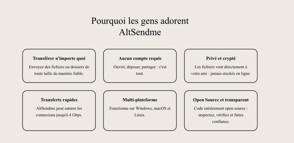 Bref, tu te retrouves à devoir choisir entre vitesse, confidentialité, limite de taille ou simplicité. Spoiler : Alt-SendMe fait tout ça en même temps.