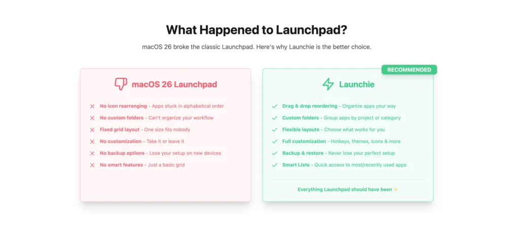 RIP Launchpad. Apple l’a supprimé dans macOS Tahoe (2025), et des milliers d’utilisateurs ont perdu leur launcher visuel préféré.
