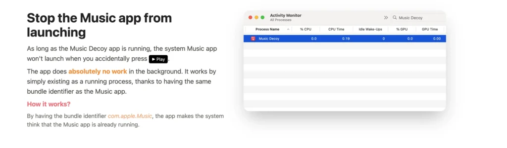Music Decoy macOS résout ce problème agaçant en 3 secondes. C’est une micro-app qui intercepte la touche Play et empêche Apple Music de se lancer. C’est tout. Pas de configuration, pas de menu, juste une solution qui marche.