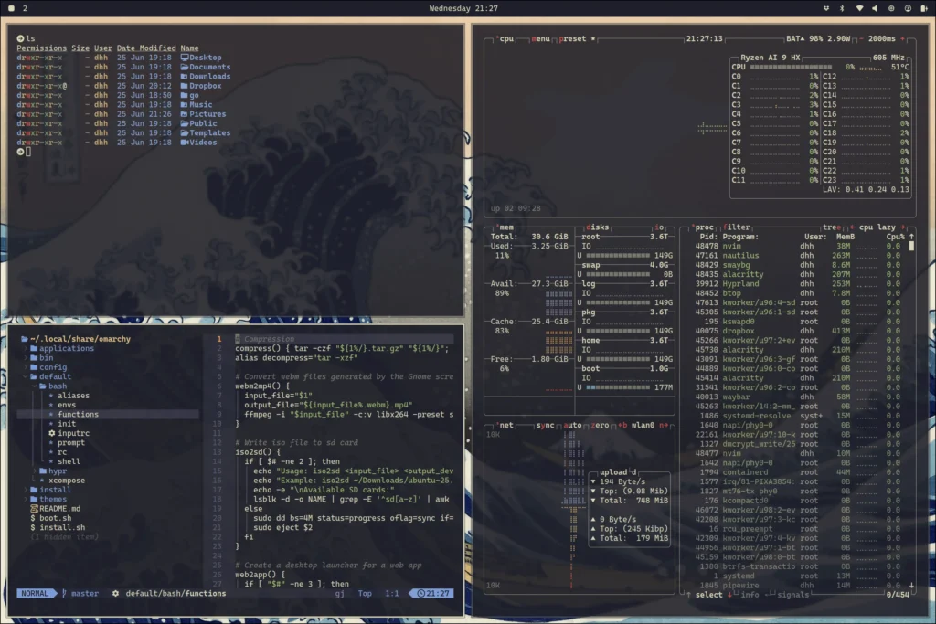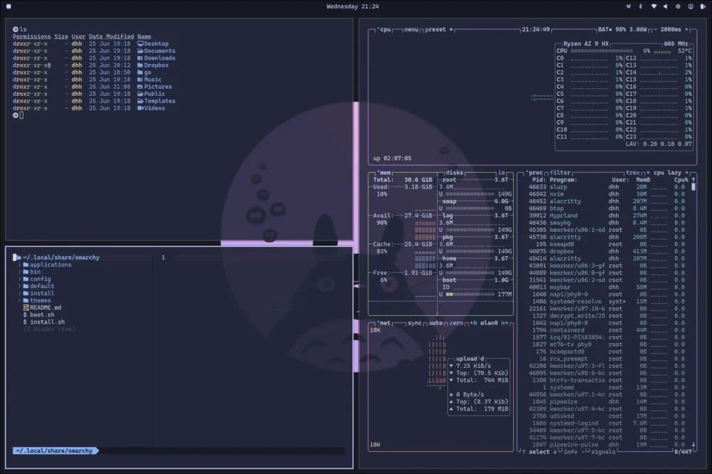 Imagine Arch Linux, mais sans la galère de configuration habituelle. Omarchy embarque :